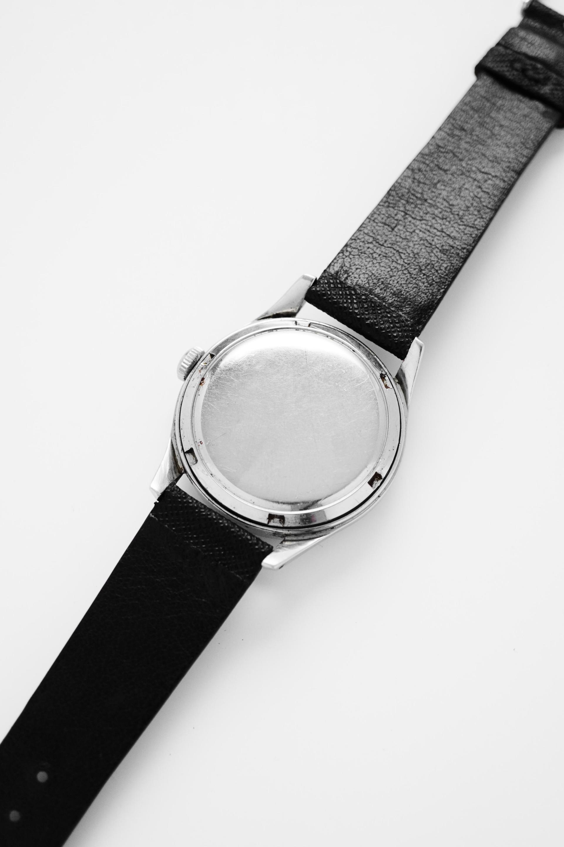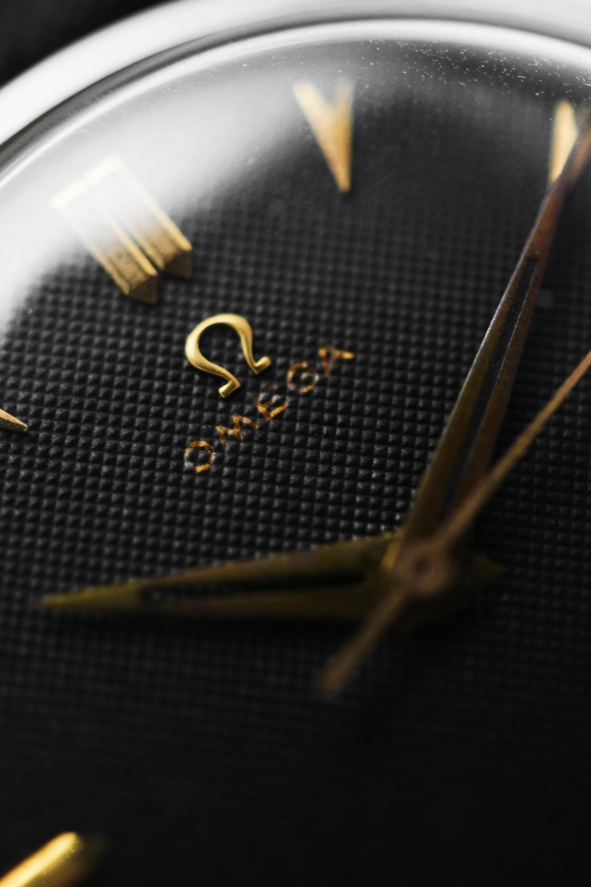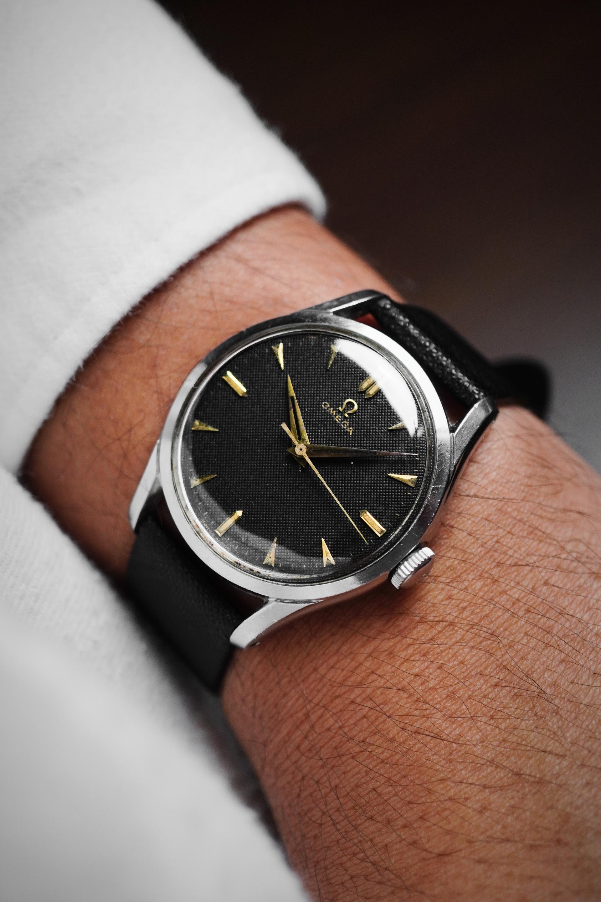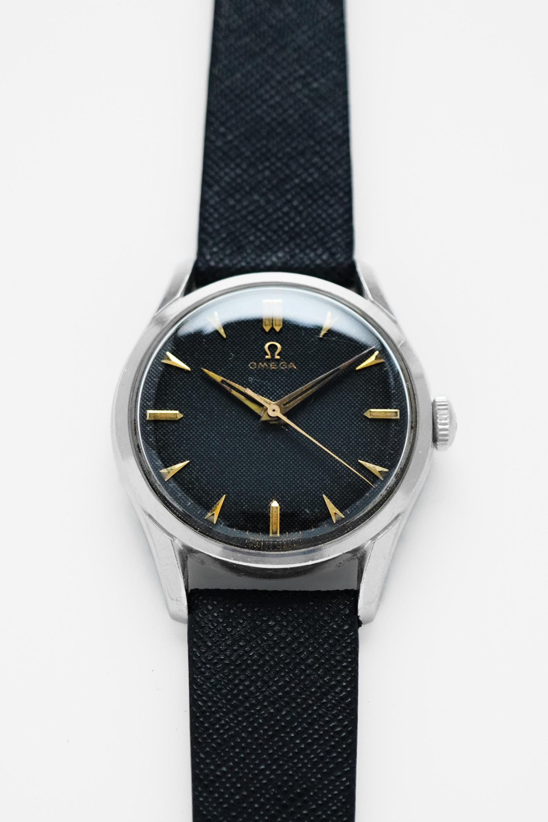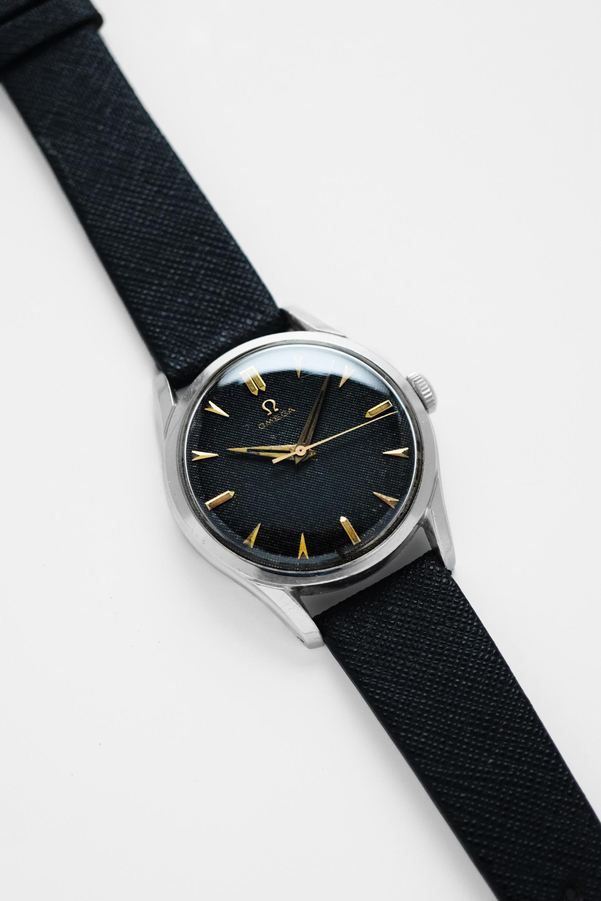 The early 1950s marked a refined chapter for Omega, when dress watches were shaped by clean proportions, elegant restraint, and timeless design language. Ref. 2640-8SC captures that spirit beautifully, pairing a classic Calatrava style case with a highly attractive dial configuration that remains deeply appealing to collectors today. What makes this example especially compelling is its black honeycomb dial, a detail that gives the watch depth, texture, and a strong visual character rarely found in more standard dress references. The gilt Omega signature, applied markers, and sharp dauphine hands create a beautiful contrast against the dark textured surface, resulting in a dial that feels both sophisticated and striking at once. Measuring 36mm without crown and 38mm with crown, this is a true jumbo size by 1950s standards, offering a confident wrist presence while still maintaining the elegance expected from a vintage Omega dress watch. Inside beats the manual winding Calibre 283, a reliable movement from Omega’s golden era. With its balanced proportions, desirable dial, and strong mid century presence, Ref. 2640-8SC stands as a vintage piece that feels equally rewarding for daily wear or long term collecting.