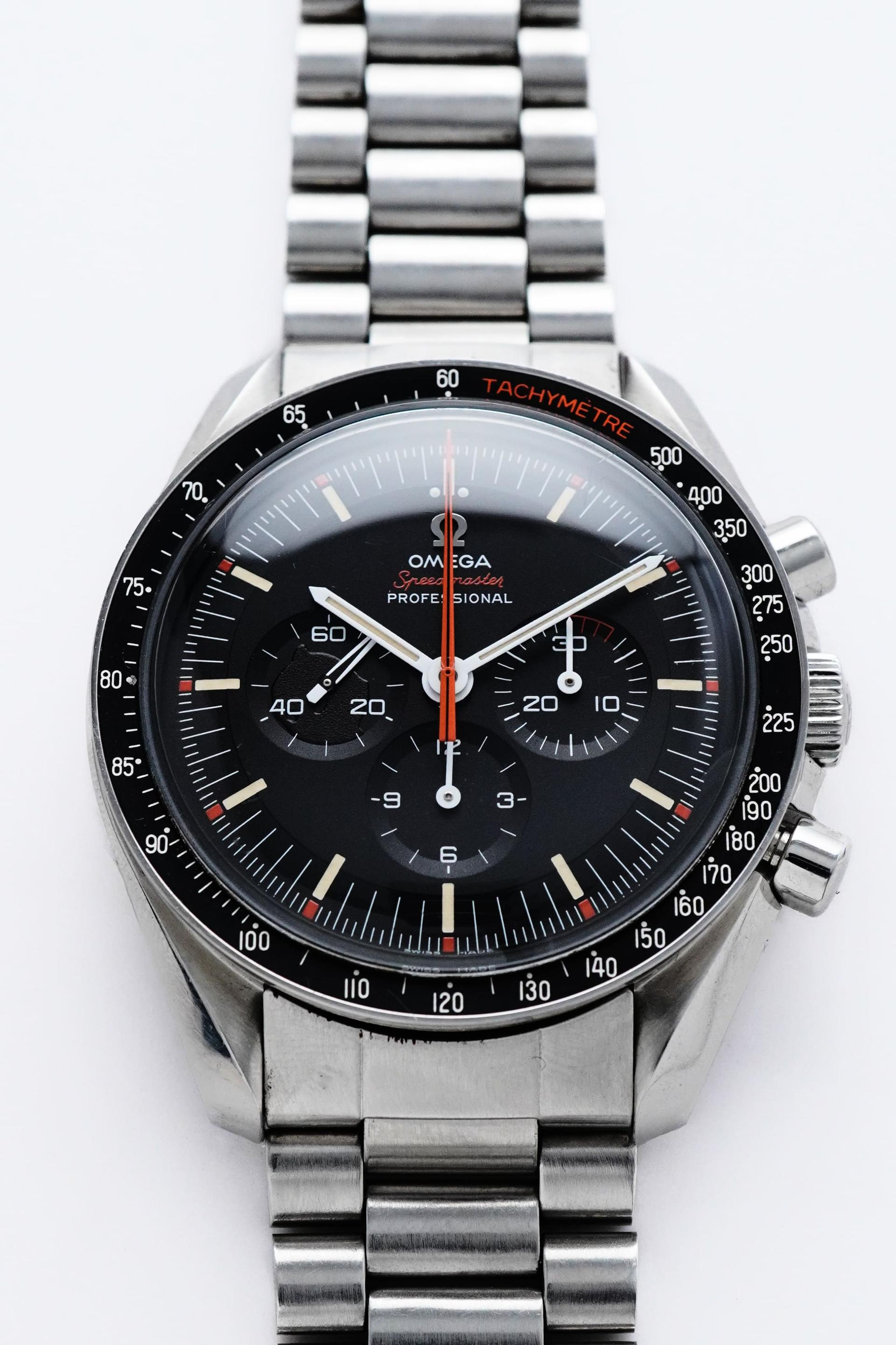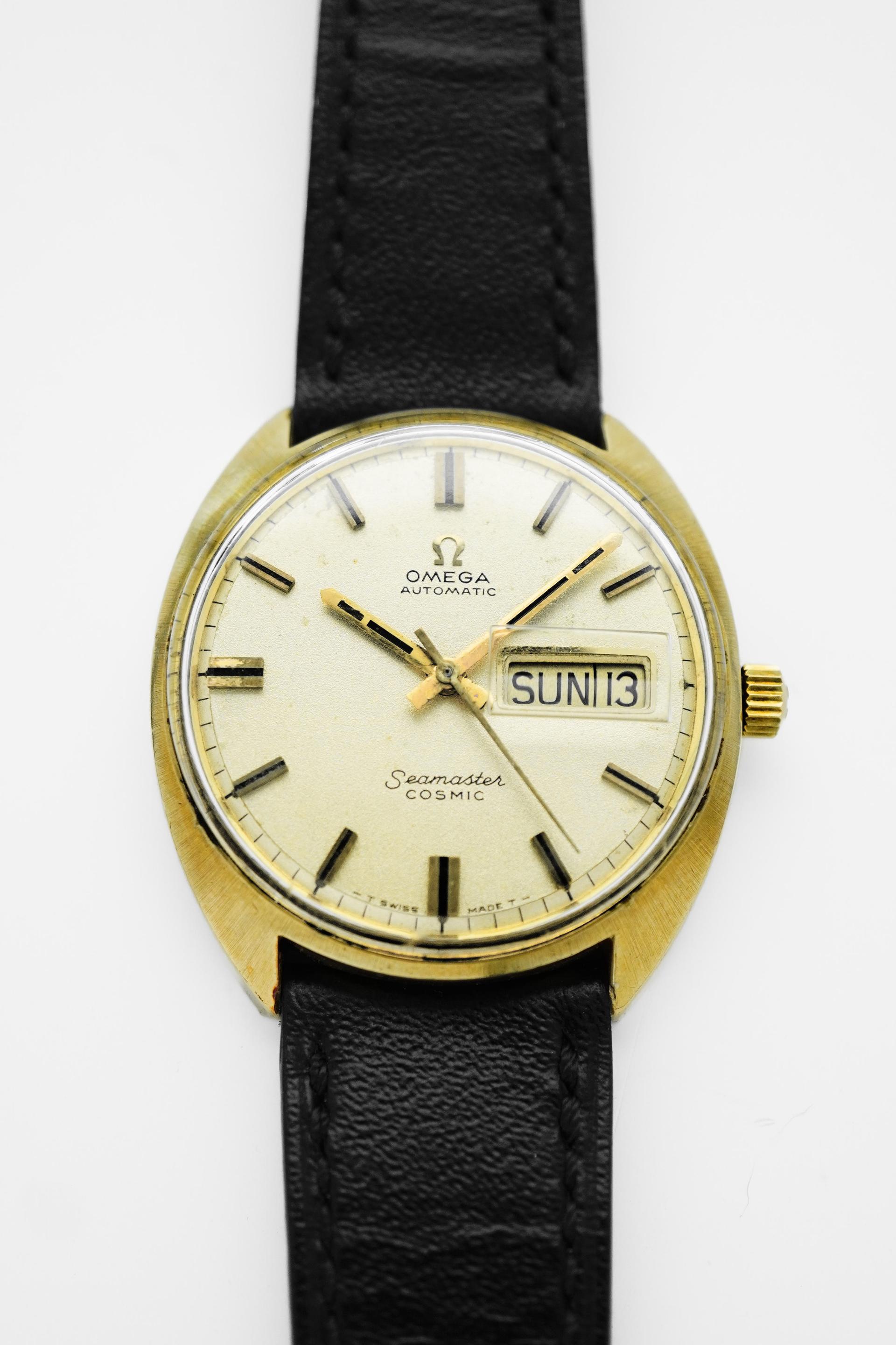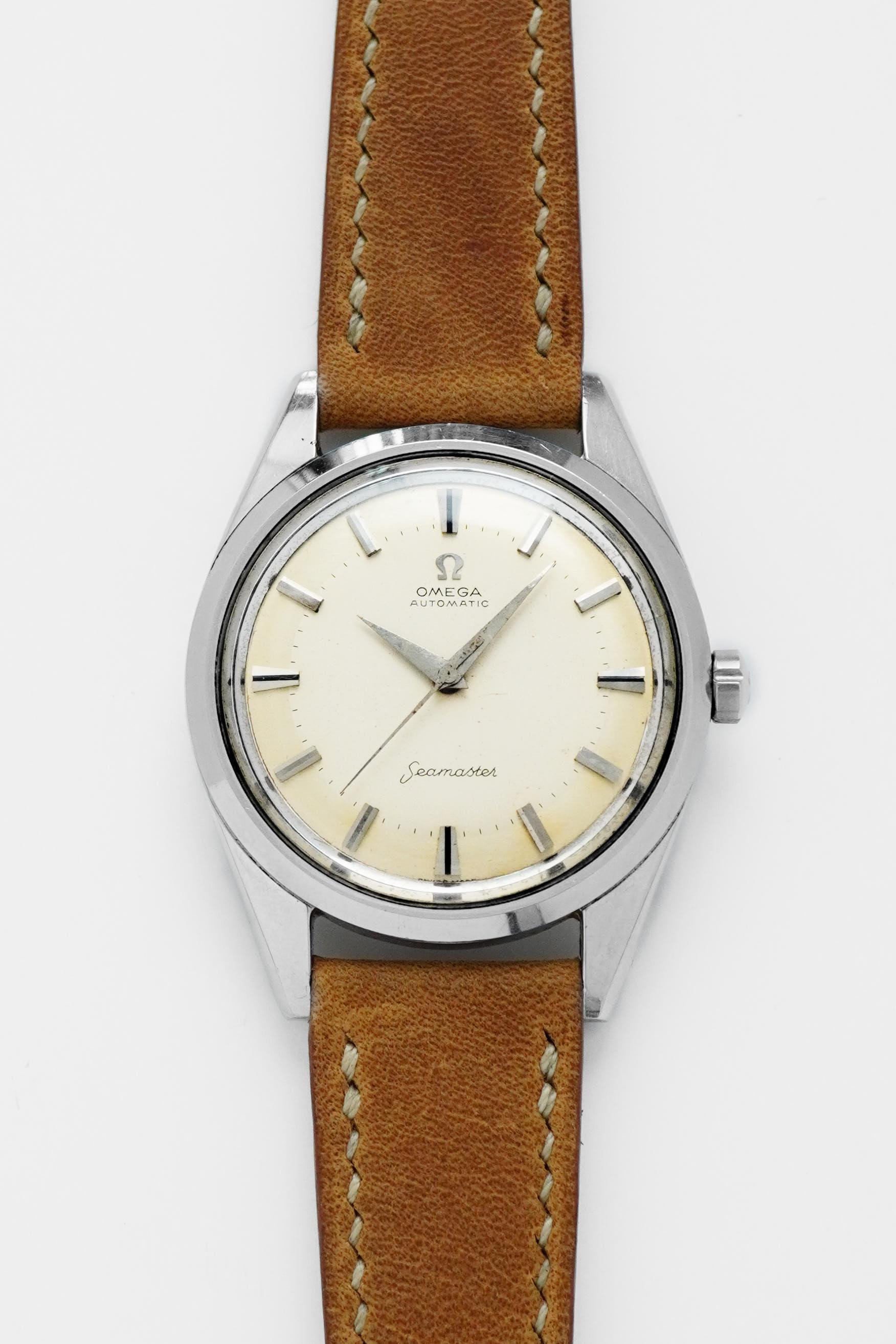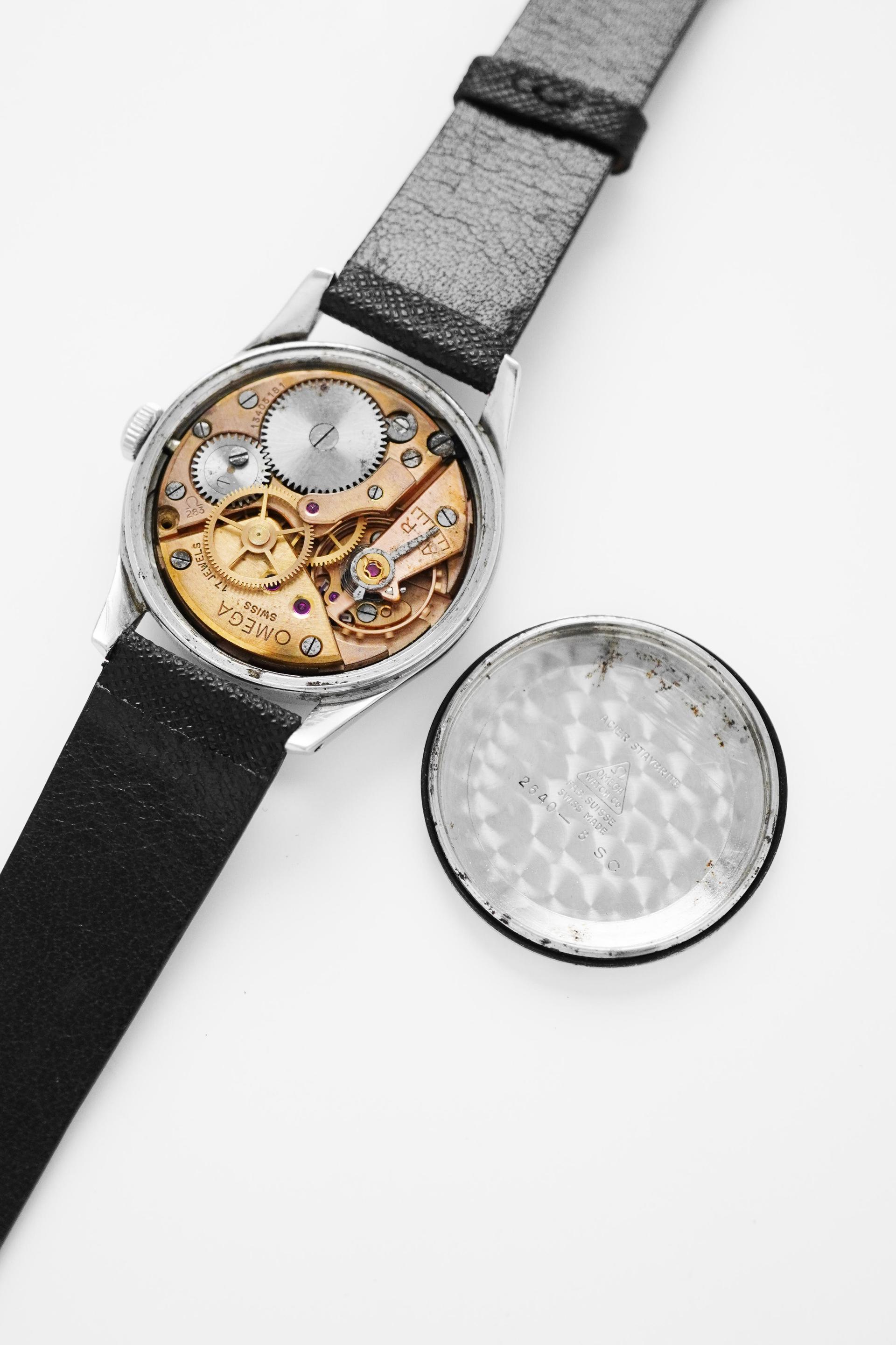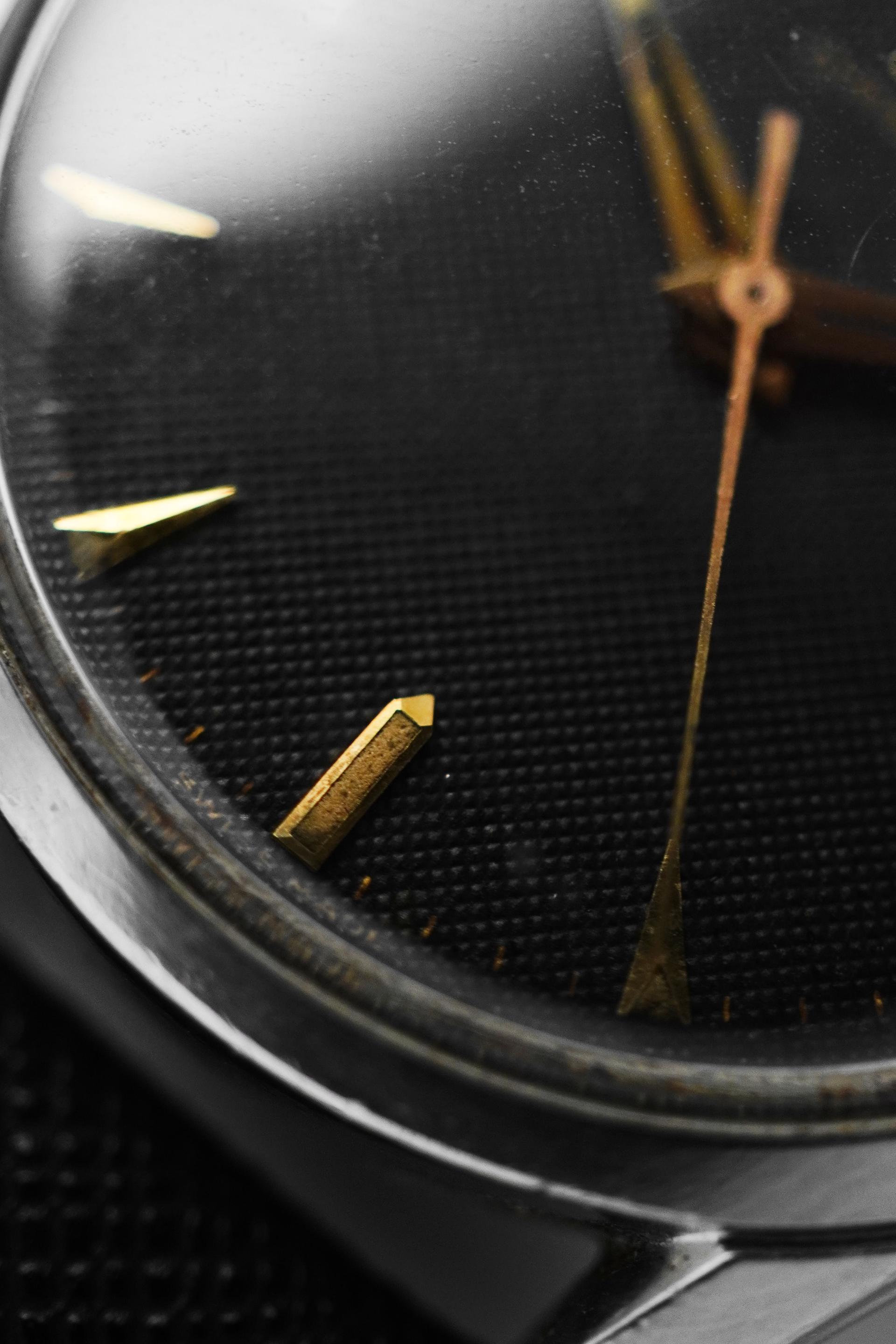 The early 1950s marked a refined chapter for Omega, when dress watches were shaped by clean proportions, elegant restraint, and timeless design language. Ref. 2640-8SC captures that spirit beautifully, pairing a classic Calatrava style case with a highly attractive dial configuration that remains deeply appealing to collectors today. What makes this example especially compelling is its black honeycomb dial, a detail that gives the watch depth, texture, and a strong visual character rarely found in more standard dress references. The gilt Omega signature, applied markers, and sharp dauphine hands create a beautiful contrast against the dark textured surface, resulting in a dial that feels both sophisticated and striking at once. Measuring 36mm without crown and 38mm with crown, this is a true jumbo size by 1950s standards, offering a confident wrist presence while still maintaining the elegance expected from a vintage Omega dress watch. Inside beats the manual winding Calibre 283, a reliable movement from Omega’s golden era. With its balanced proportions, desirable dial, and strong mid century presence, Ref. 2640-8SC stands as a vintage piece that feels equally rewarding for daily wear or long term collecting.