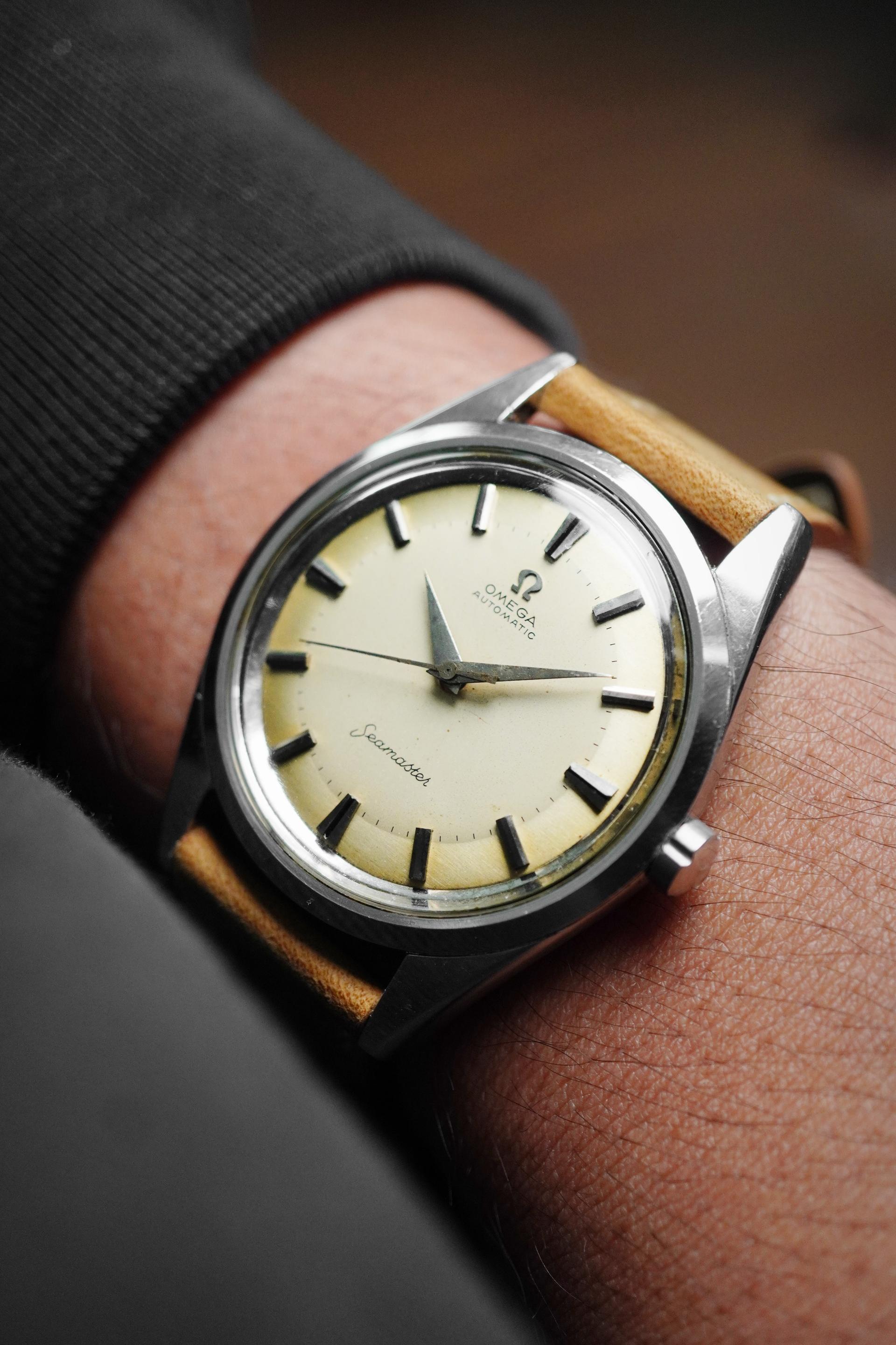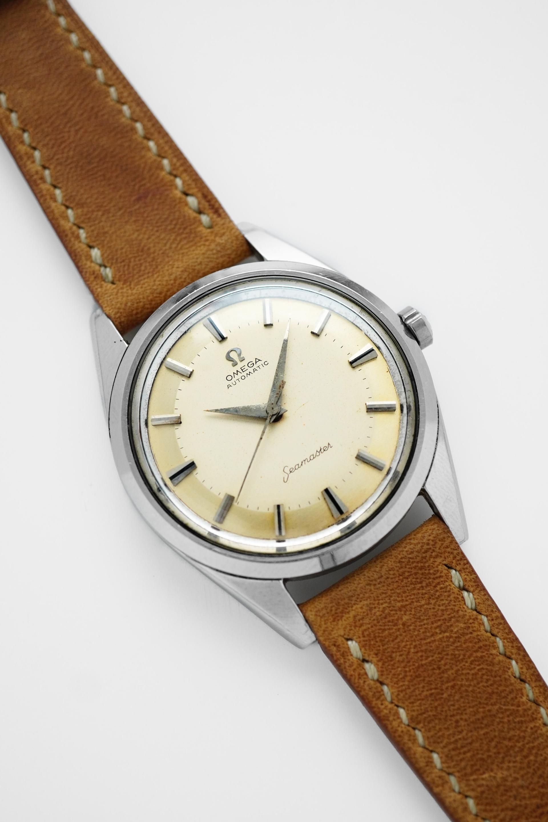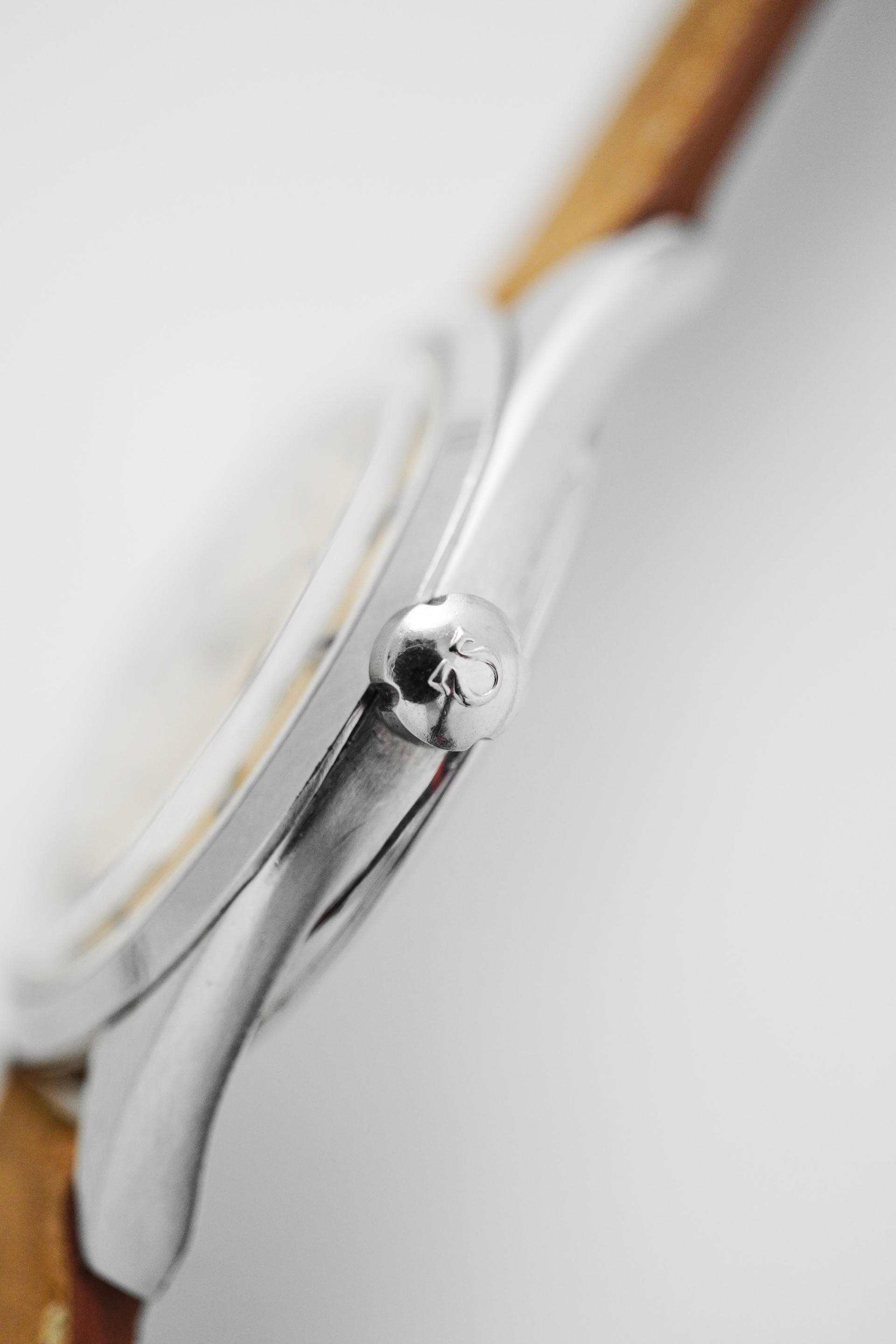 The 1950s was a remarkable era for Omega, when the Seamaster line began to define itself as a perfect blend of everyday reliability and understated elegance. Ref. 2976-2 SC stands as a particularly compelling example from that period, offering the timeless character of a vintage Seamaster in a very rare jumbo configuration that feels especially desirable today. This example carries all the mid-century details collectors continue to appreciate, from its clean dial layout to the sharp dauphine hands and applied baton indices that give the watch a refined, balanced presence. The simplicity of the design is exactly what makes it so attractive nothing feels excessive, yet every element works together to create that unmistakable vintage Omega charm. Measuring 38mm without crown and 40.5mm with crown, with a 48mm lug to lug, this is an impressively large watch for its era and one that wears with real presence on the wrist. Inside beats the automatic Calibre 501, one of Omega’s respected movements from its golden period, known for both reliability and smooth performance. With its rare proportions, elegant case profile, and strong vintage appeal, Ref. 2976-2 SC is a Seamaster that offers both collector value and everyday wearability.