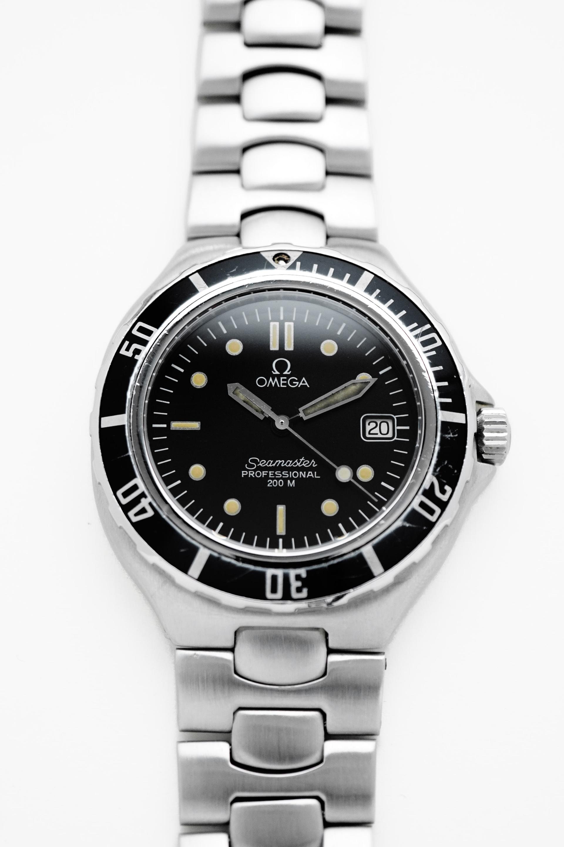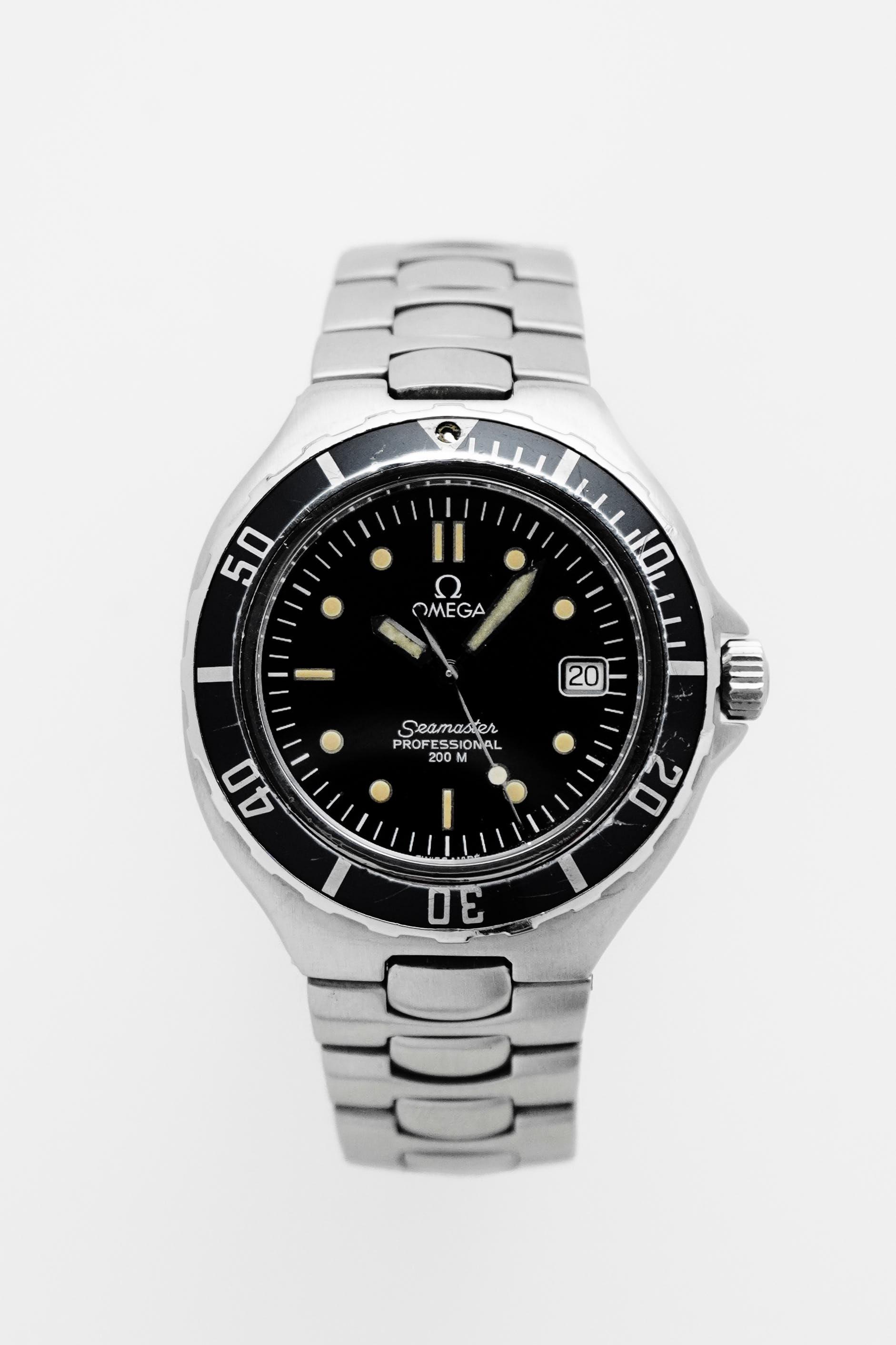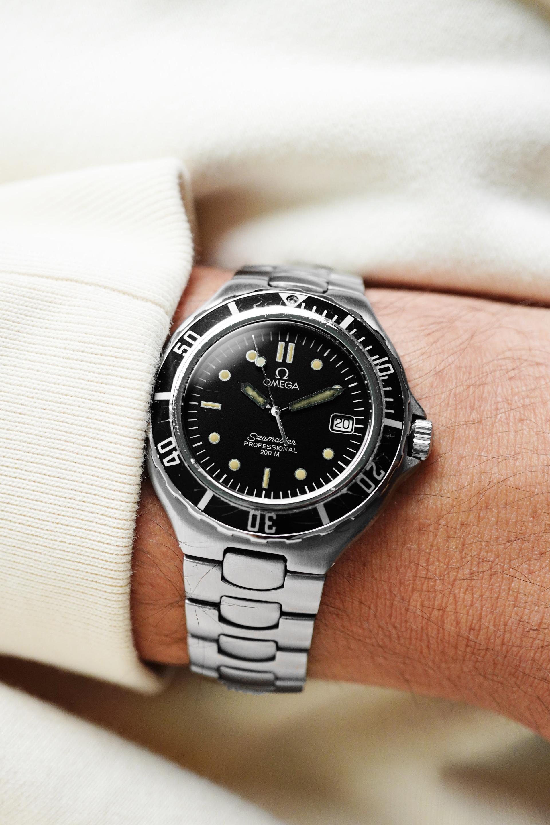 Before the Bond era redefined the Seamaster for a new generation, there was the Pre-Bond. Produced in the late 1980s, this reference represents the transitional period where Omega refined the modern dive watch formula cleaner lines, slimmer case profile, and unmistakable tool watch presence. This Seamaster Pre-Bond 200M features a classic black dial with bold luminous markers, paired with a unidirectional black bezel that delivers pure vintage dive aesthetics. The balanced 36.5mm case gives it the perfect neo vintage proportion compact, sporty, and extremely wearable for daily use. Powered by the reliable Quartz Calibre 1438, this piece offers precision, practicality, and low maintenance ownership. At just 9mm thickness, it wears slimmer than most dive watches, sliding effortlessly under a cuff while still retaining its 200 meter professional capability.