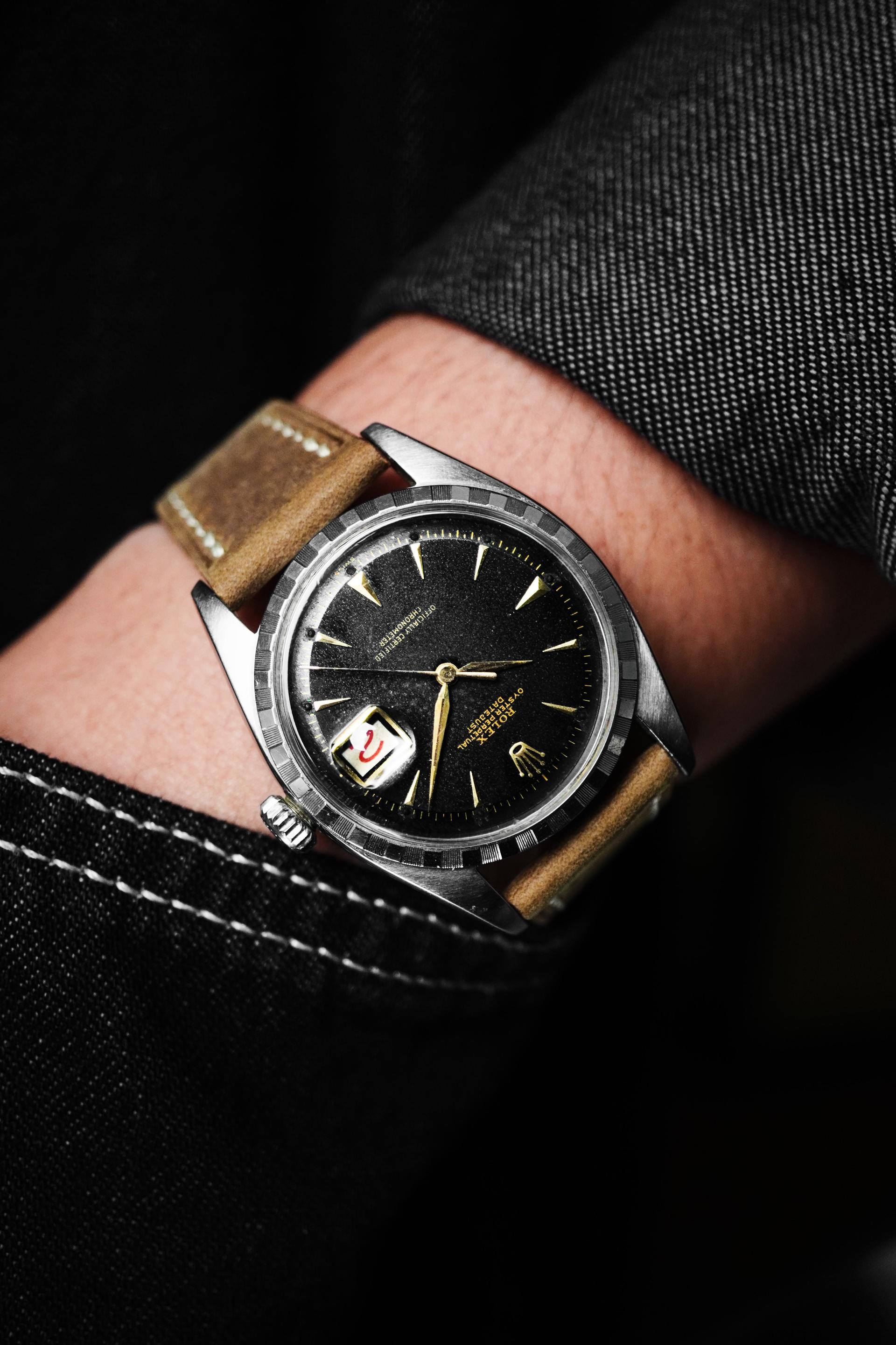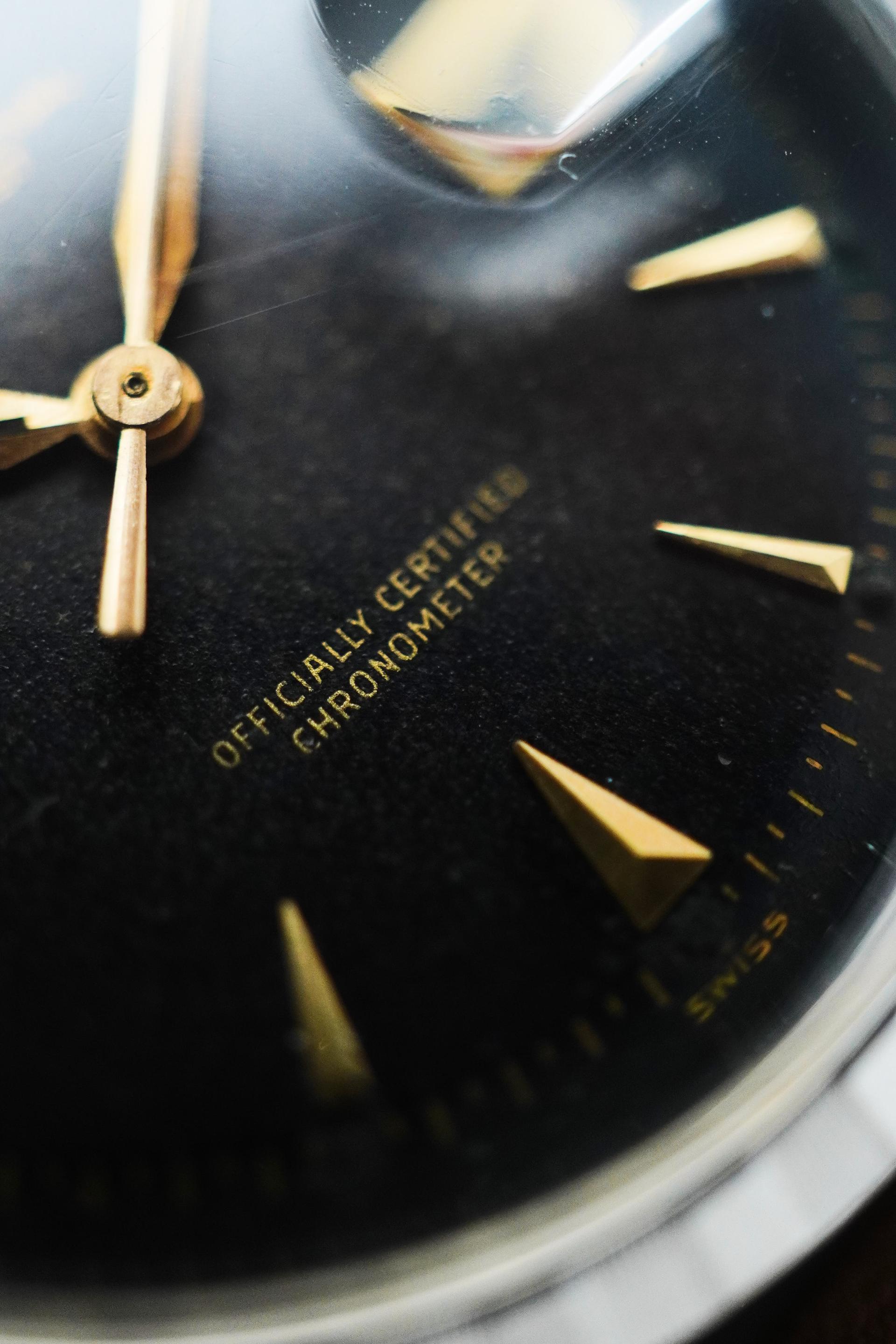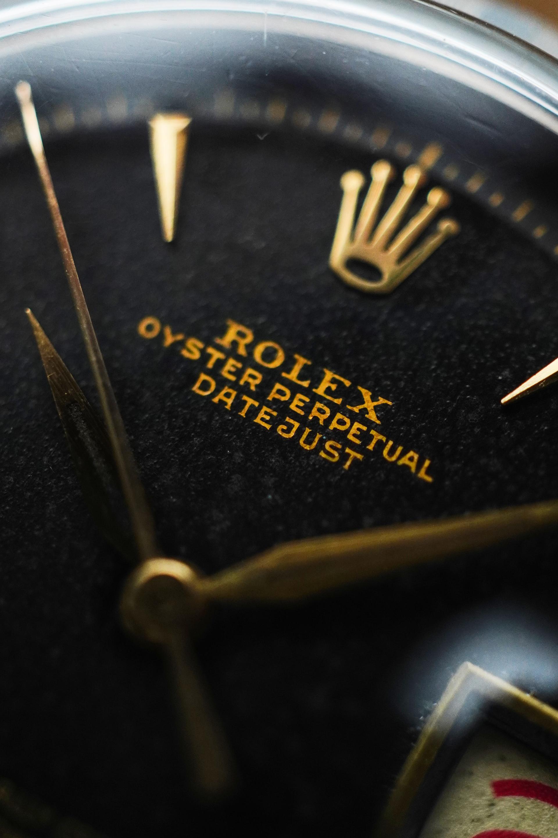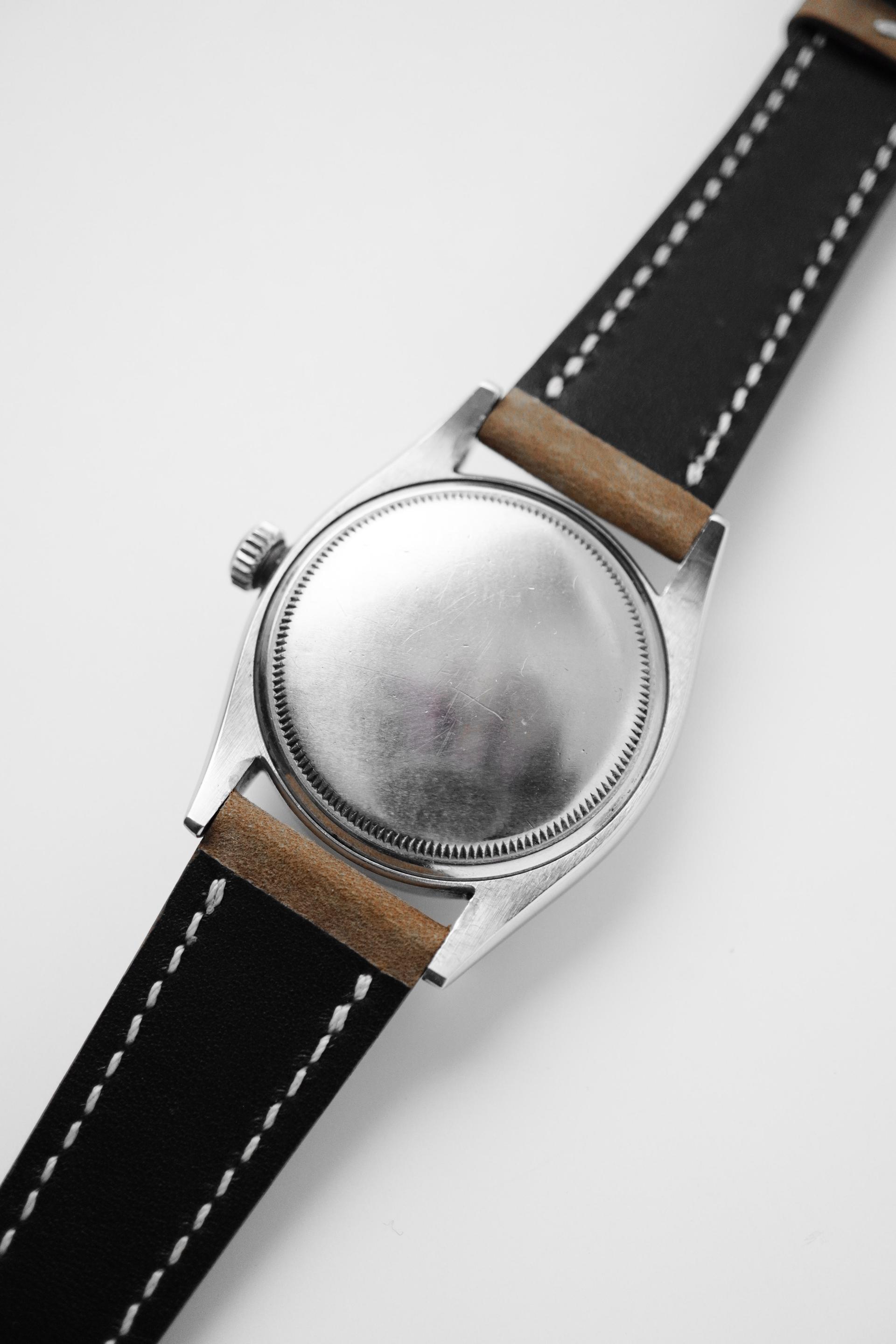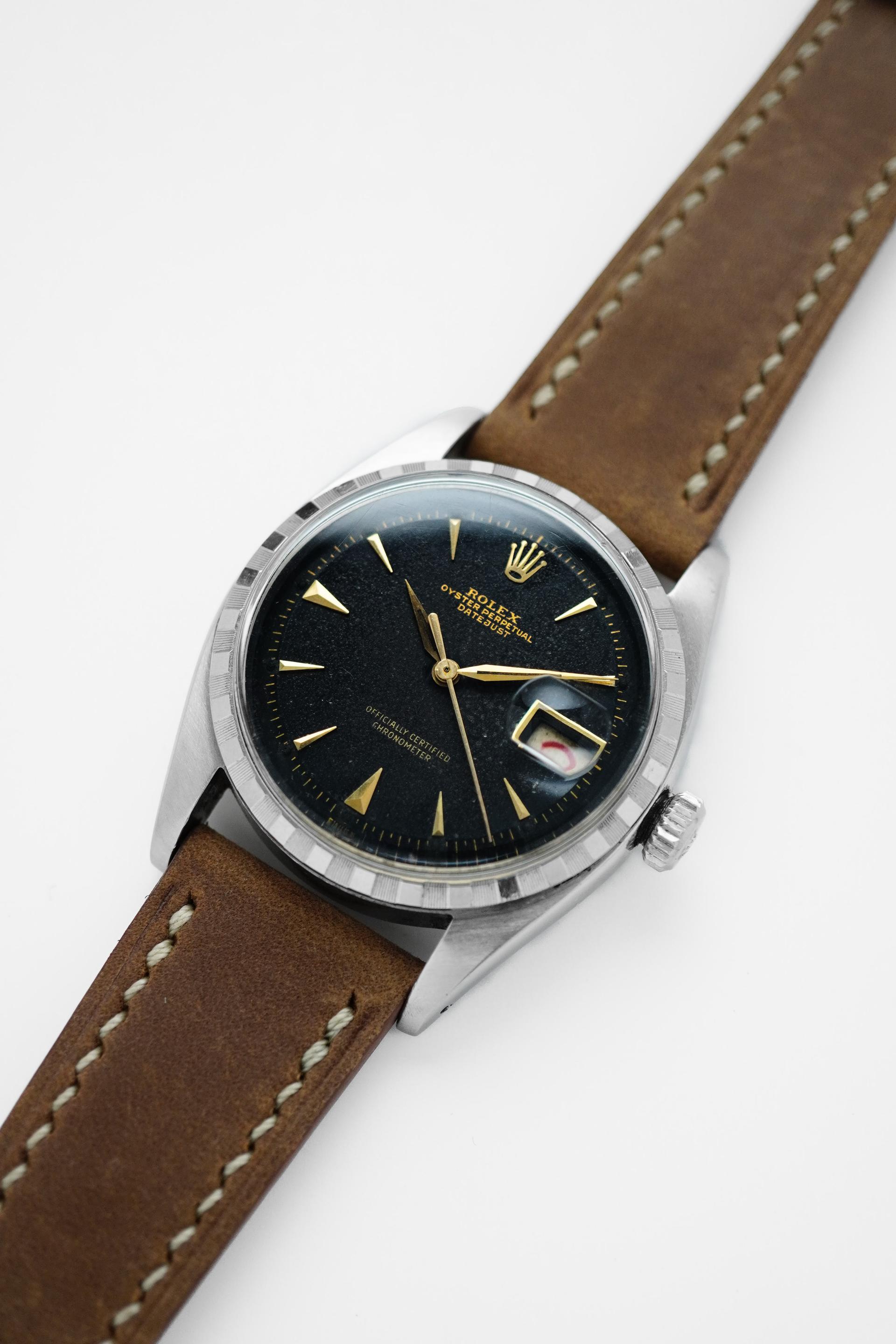 The Datejust has long stood as one of Rolex’s most enduring designs, blending practicality, elegance, and unmistakable character in a way few watches ever could. This vintage example carries that balance beautifully, with a configuration that feels more restrained and distinctive than the more commonly seen Datejust variations. Its black dial gives the watch a stronger, dressier presence, while the applied dagger indices and alpha hands add the kind of sharp mid century detail collectors continue to appreciate. Paired with the engine-turned bezel, the overall look feels crisp and refined, offering texture and contrast without relying on excess. It is a configuration that speaks quietly, yet leaves a very strong impression on the wrist. Measuring 36mm without crown and 39mm with crown, with a lug to lug of 44mm and 20mm lug width, this Datejust wears with classic vintage proportions while still feeling substantial enough for modern daily use. Inside beats the automatic Cal. A.296, a movement from Rolex’s celebrated earlier era, completing a piece that offers both timeless aesthetics and authentic vintage appeal.